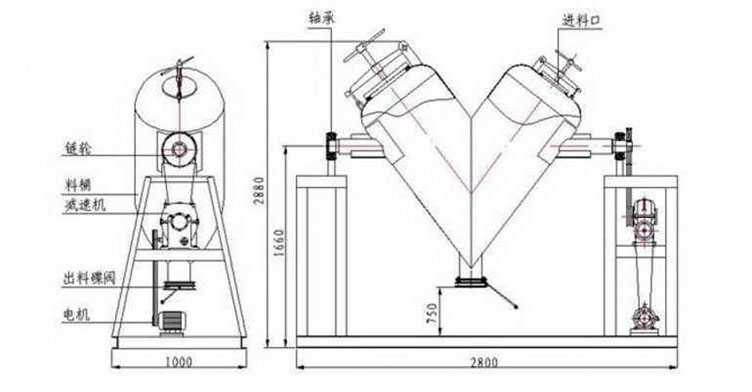 本機通過減速機構(gòu)帶動筒體旋轉(zhuǎn),利用混合機兩圓柱筒長度的不相等形成的不對稱進(jìn)行混合,當(dāng)混合機運動時,物料從分解到組合,由于勢能的不同,就產(chǎn)生了一個橫向力,推動物料進(jìn)行橫向交流。當(dāng)物料從組合到分解,由于物料平面不同,就產(chǎn)生了一個橫向力又推動物料進(jìn)行橫向交流。筒體旋轉(zhuǎn)一周,約使25%的物料從一個筒體流向另一個筒;同時筒體旋轉(zhuǎn)時又使物料產(chǎn)生徑向流動,這樣物料進(jìn)行橫向、徑向分解,組合交替進(jìn)行,使物料達(dá)到非常均勻的效果。